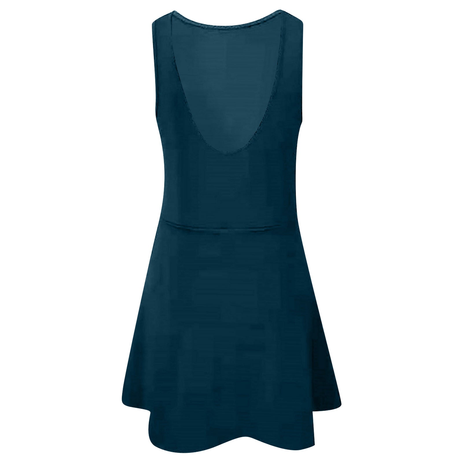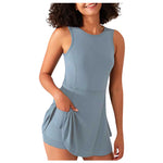 Introducing our stunning U-shaped backless sleeveless yoga dress with shorts! Designed for ultimate comfort and flexibility, this dress is perfect for all your fitness needs. The dress is crafted from a soft and stretchy fabric that feels luxurious against your skin. The shorts underneath are also made from the same fabric and feature a convenient pocket, perfect for storing your phone, keys or any other small essentials while you exercise. The dress features a stylish U-shaped backless design, this dress allows for maximum range of motion while keeping you cool and comfortable during your workout.